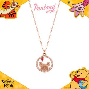 Kalung Heron memiliki liontin berbentuk kepala beruang Pooh yang ditempatkan di dalam lingkaran berhiaskan deretan kristal bening. Pada bagian atas lingkaran terdapat satu kristal berbentuk setetes hati berwarna merah, memberikan sentuhan manis dan romantis pada desainnya.